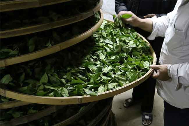 曬青完的茶葉要及時放到?jīng)銮嚅g攤涼,散熱,不可曬過度,也不可堆在一起,必須均勻。葉子還新鮮還有呼吸作用,悶在一起會發(fā)熱影響發(fā)酵品質(zhì)。