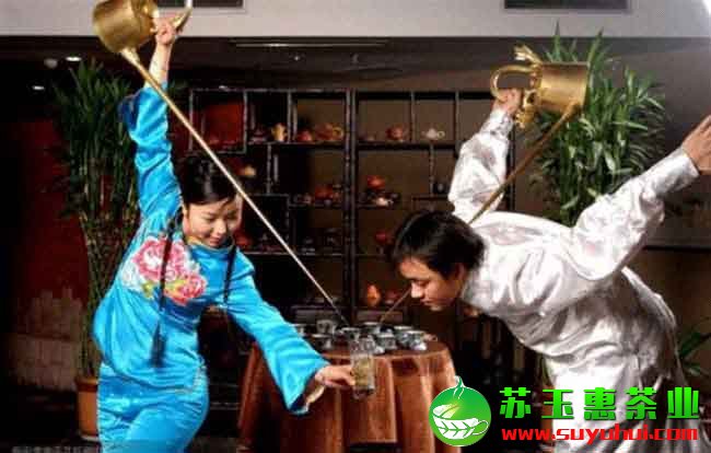 第三,高山流水、春風(fēng)拂面。將開水壺提高,向紫砂壺內(nèi)沖水,使壺內(nèi)的茶葉隨水浪翻流滾,起到開水洗茶的作用,后用壺蓋輕輕地刮去表面泛起的白色泡沫,取意春風(fēng)拂面。