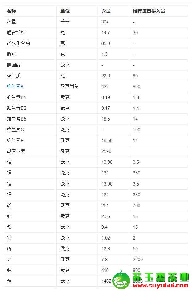 3、錳:具有抗氧化及防止老化之功效,增強免疫功能,并有助于鈣的利用。因不溶于熱水,可磨成茶粉食用。